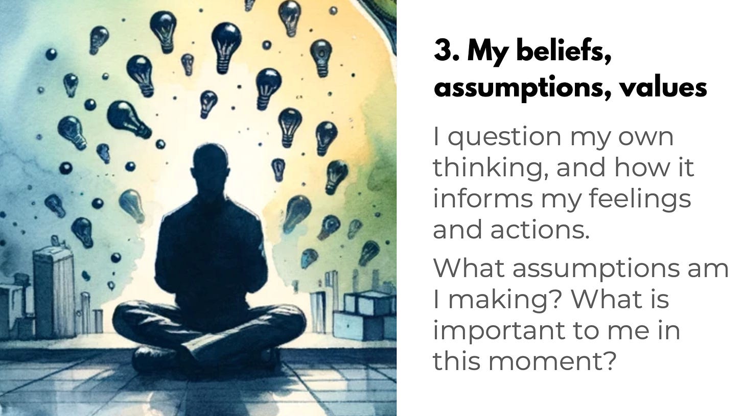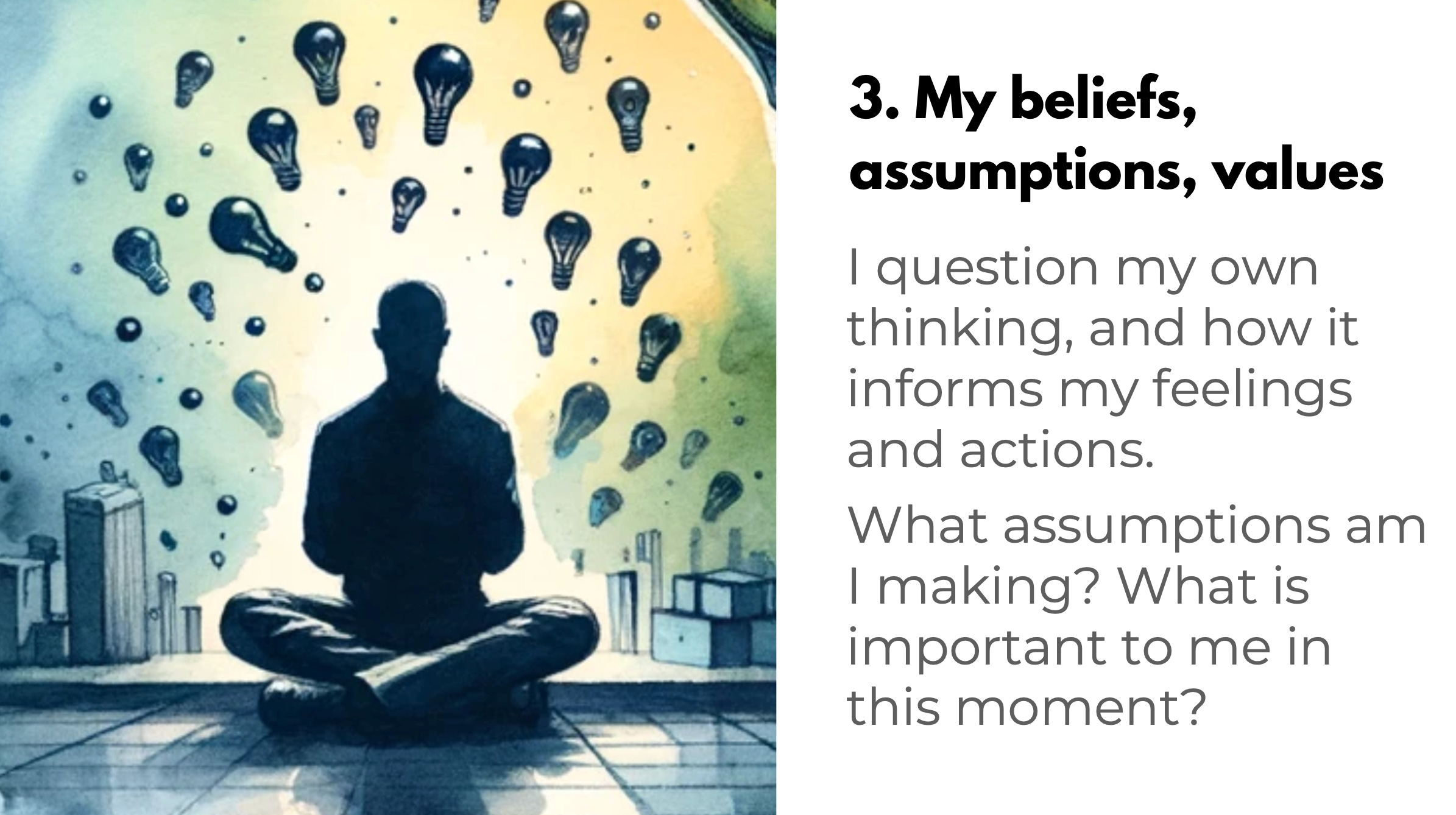 It also means being able to then shift your attention deeper, towards the assumptions you are making. What are you taking as ‘truth’ in this situation? What convictions/beliefs are informing your thoughts and actions? Can you hold your assumptions lightly? Can you get curious as to how you have come to believe what you believe? What possibilities might open up if your assumptions shifted even a little?