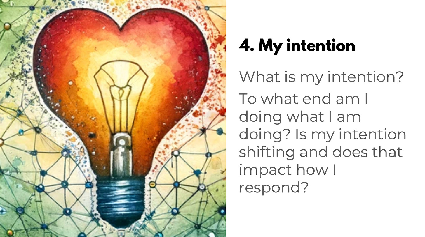 And finally, the fourth territory is Intention. Why are you doing what you are doing? What is your end-goal here, now? Are you perhaps noticing how you might enter a conversation with a positive intention to help or solve a problem, but then the other person says/does something that pushes your buttons and, unbeknownst to you, your intention shifts towards wanting to defend yourself, or prove them wrong (and yourself right), or perhaps winning the argument?